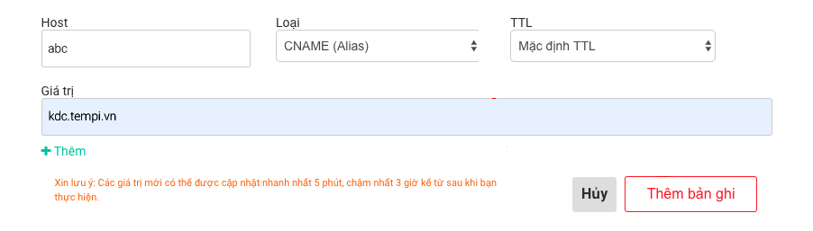 Host record: www Type (Loại): CNAME Points to: kdc.tempi.vn