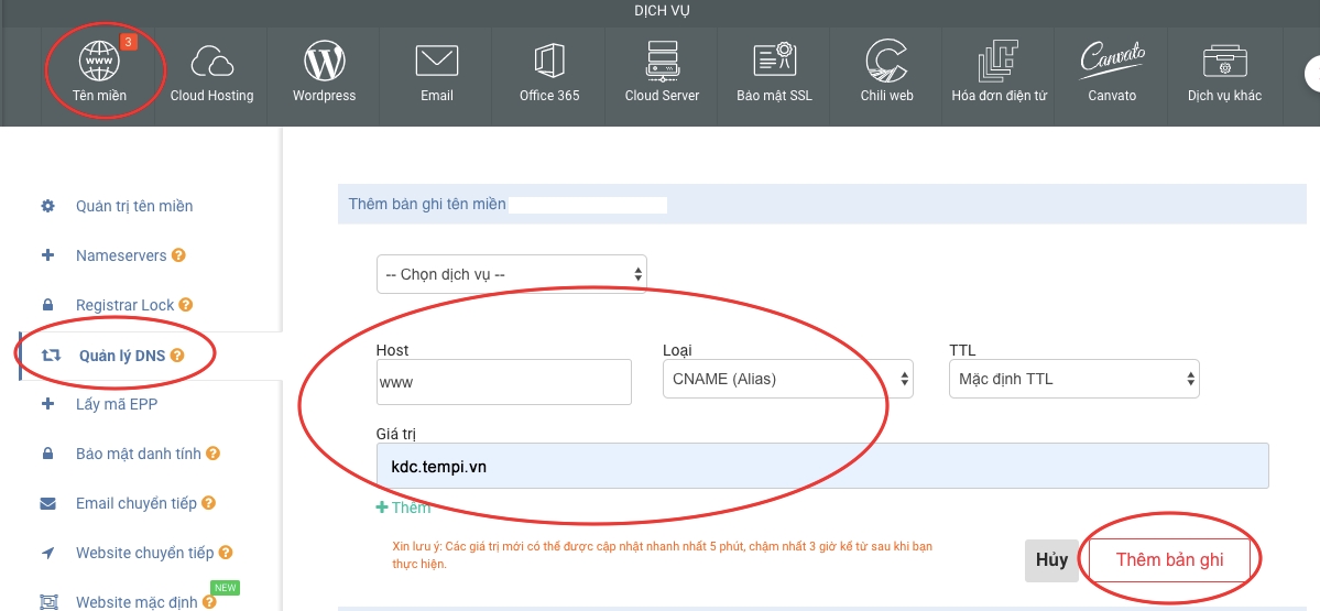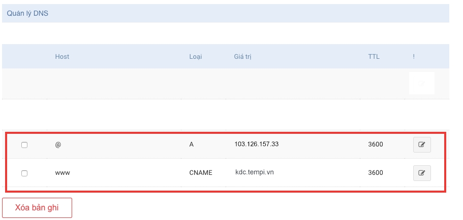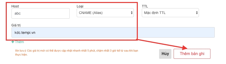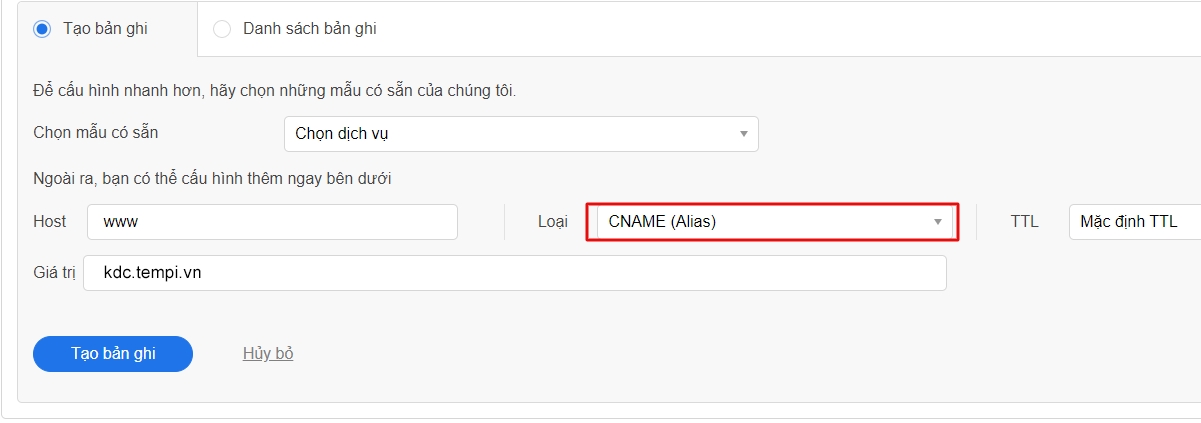Host record: www Type (Loại): CNAME Value (Giá trị): kdc.tempi.vn