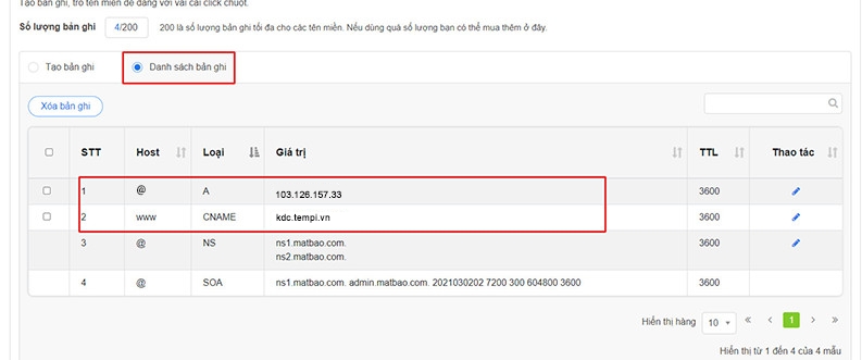 Sau khi tạo xong, phần danh sách bản ghi hiển thị đủ 2 bản ghi này là bạn đã tạo đúng cách: