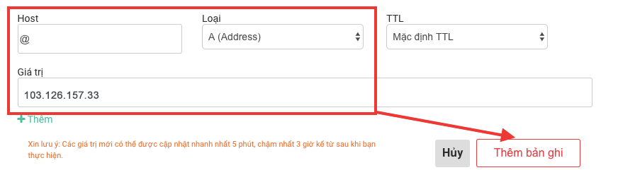 Host record: @ Type (Loại): A Value (Giá trị): 103.126.157.43