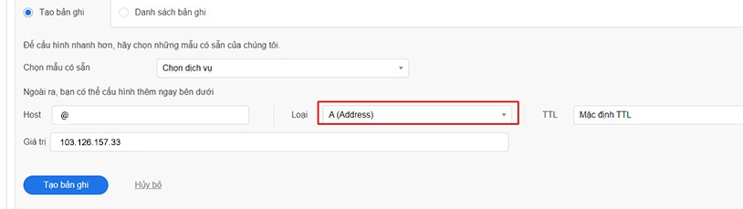Host record: @ Type (Loại): A Value (Giá trị): 103.126.157.33