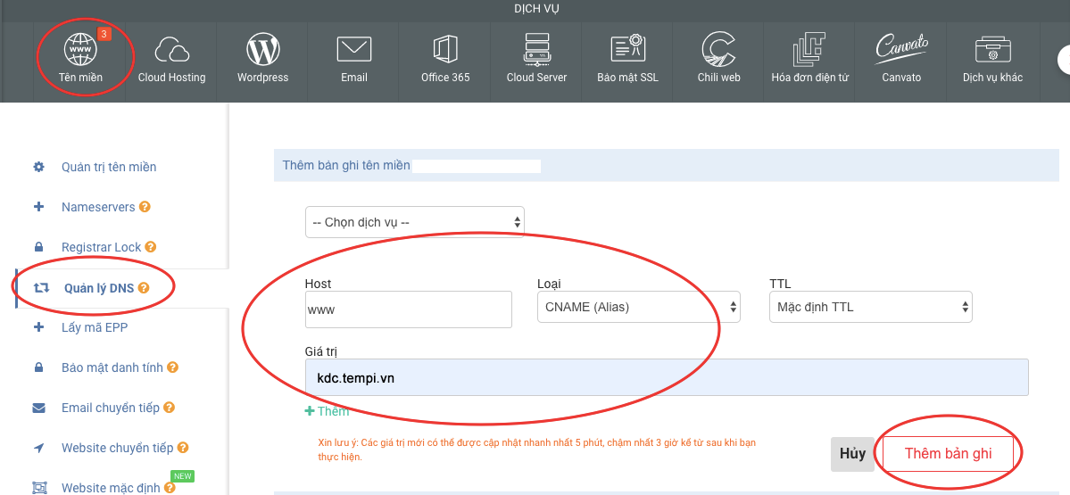 Giả sử tên miền chính của bạn là tenmiencuaban.vn, và bạn muốn tạo một tên miền phụ là abc.tenmiencuaban.vn. Chọn tên miền chính bạn muốn cài đặt, sau đó tạo một bản ghi mới và điền các giá trị như sau: Host record: abc Type (Loại): CNAME Value (Giá trị): kdc.tempi.vn