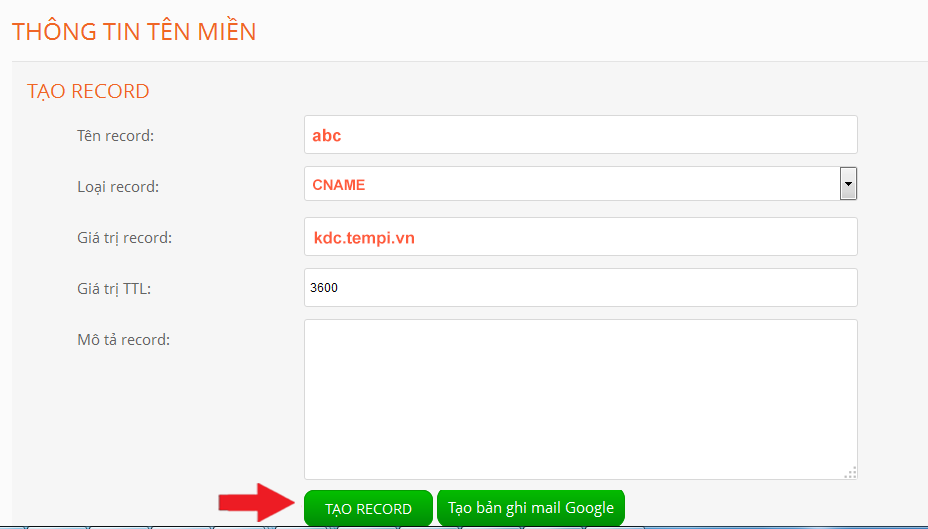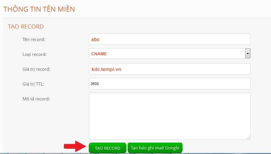 Giả sử tên miền chính của bạn là tenmiencuaban.vn, bạn muốn tạo một tên miền phụ là abc.tenmiencuaban.vn thì: Chọn tên miền chính bạn muốn cài đặt, sau đó tạo một bản ghi mới và điền các giá trị như sau: Host record: abc Type (Loại): CNAME Value (Giá trị): kdc.tempi.vn