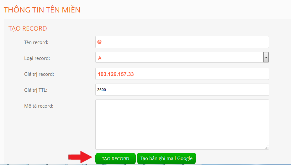Host record: www Type (Loại): CNAME Value (Giá trị): kdc.tempi.vn