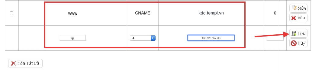 Host record: www Type (Loại): CNAME Value (Giá trị): kdc.tempi.vn