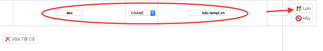Giả sử tên miền chính của bạn là tenmiencuaban.vn, bạn muốn tạo một tên miền phụ là abc.tenmiencuaban.vn thì: Chọn tên miền chính bạn muốn cài đặt, sau đó tạo một bản ghi mới và điền các giá trị như sau: Host record: abc Type (Loại): CNAME Value (Giá trị): kdc.tempi.vn